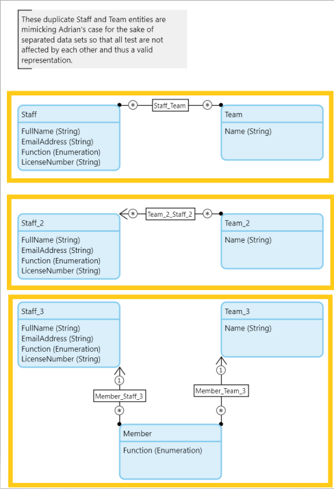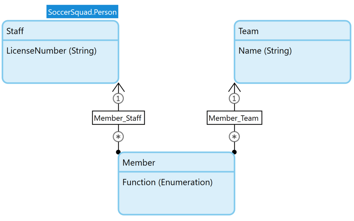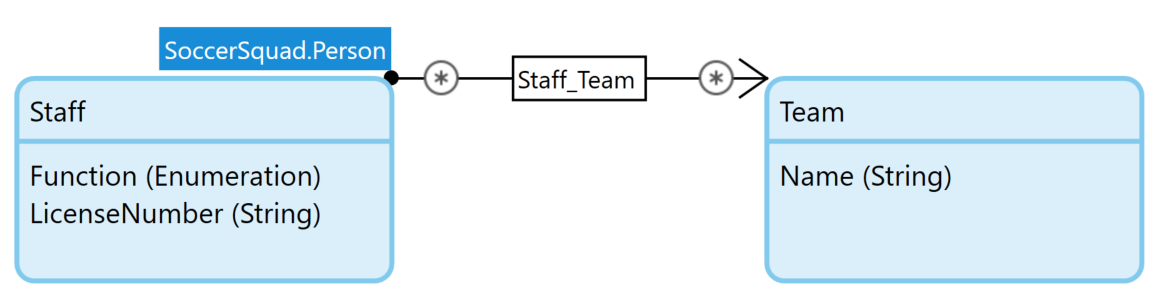 팀을 편집할 때 스태프를 팀에 할당할 수 있다면 편리할 것이라고 상상할 수 있습니다. 따라서 Team은 연결의 소유자이기도 해야 합니다. 쉬운 트릭은 연결 탐색 가능성을 둘 다로 설정하는 것입니다 – Team 및 Staff 개체는 서로를 참조합니다. 그러면 다음과 같은 도메인 모델이 생성됩니다.