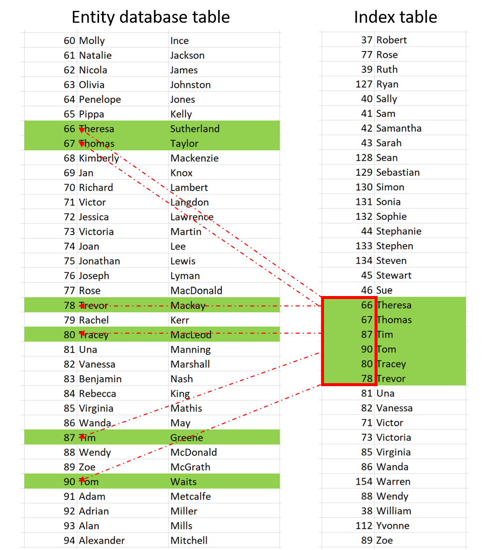 'T'로 시작하는 이름을 검색하기 시작한다고 가정해 보겠습니다. 데이터베이스는 먼저 인덱스 테이블을 살펴보고, 제한된 레코드 목록을 정의하고, ID를 가져오고, ID로 데이터베이스 테이블에서 전체 레코드를 검색합니다.