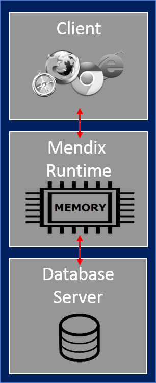 - Mendix 클라이언트, Mendix 런타임 및 데이터베이스 서버가 함께 작동하는 방식을 요약합니다.