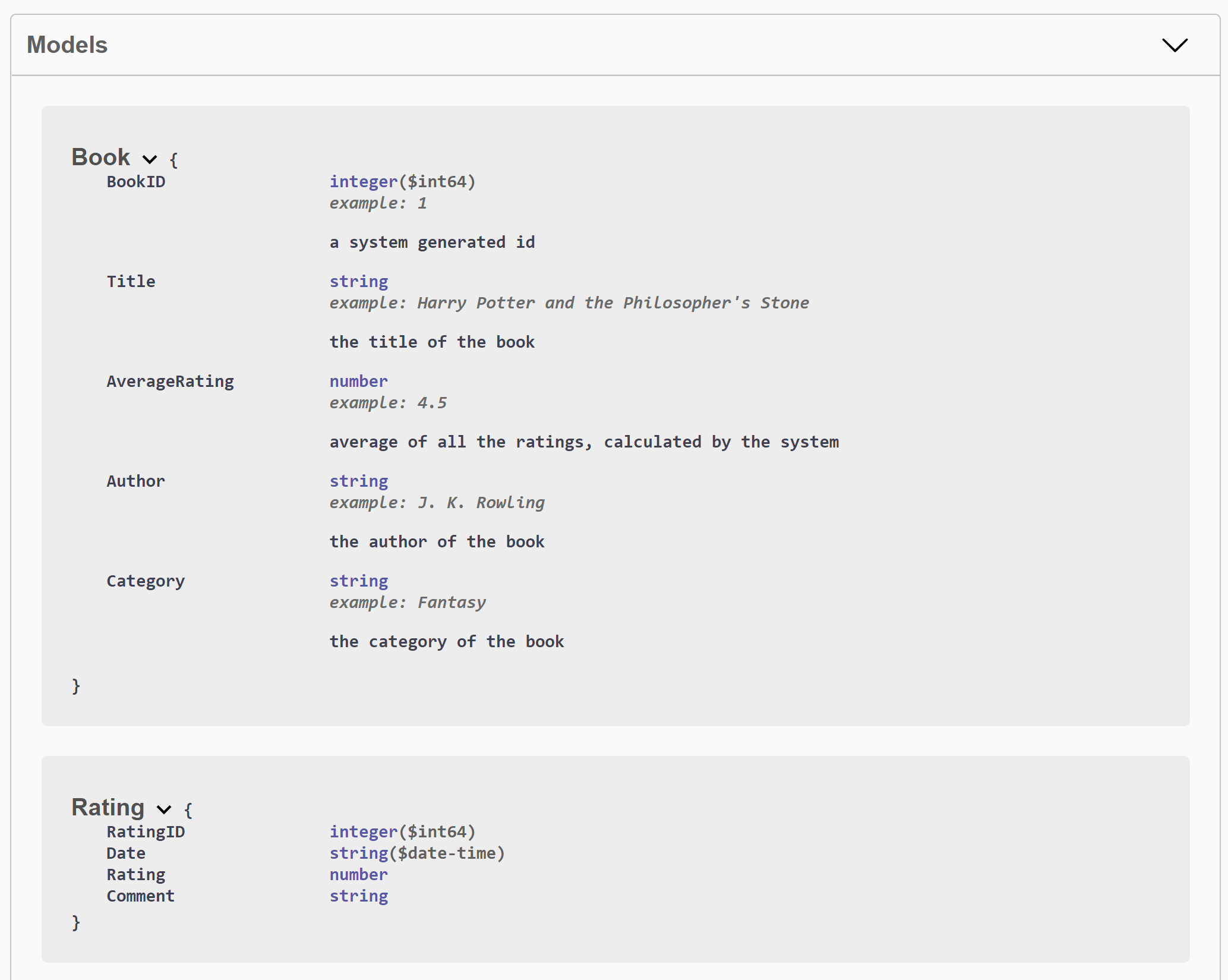모델은 사용자가 API 구조를 이해하는 데 도움이 될 수 있습니다. Swagger 페이지에 표시되는 모델은 서비스에 대해 설정한 가져오기 및 내보내기 정의에 따라 달라집니다.