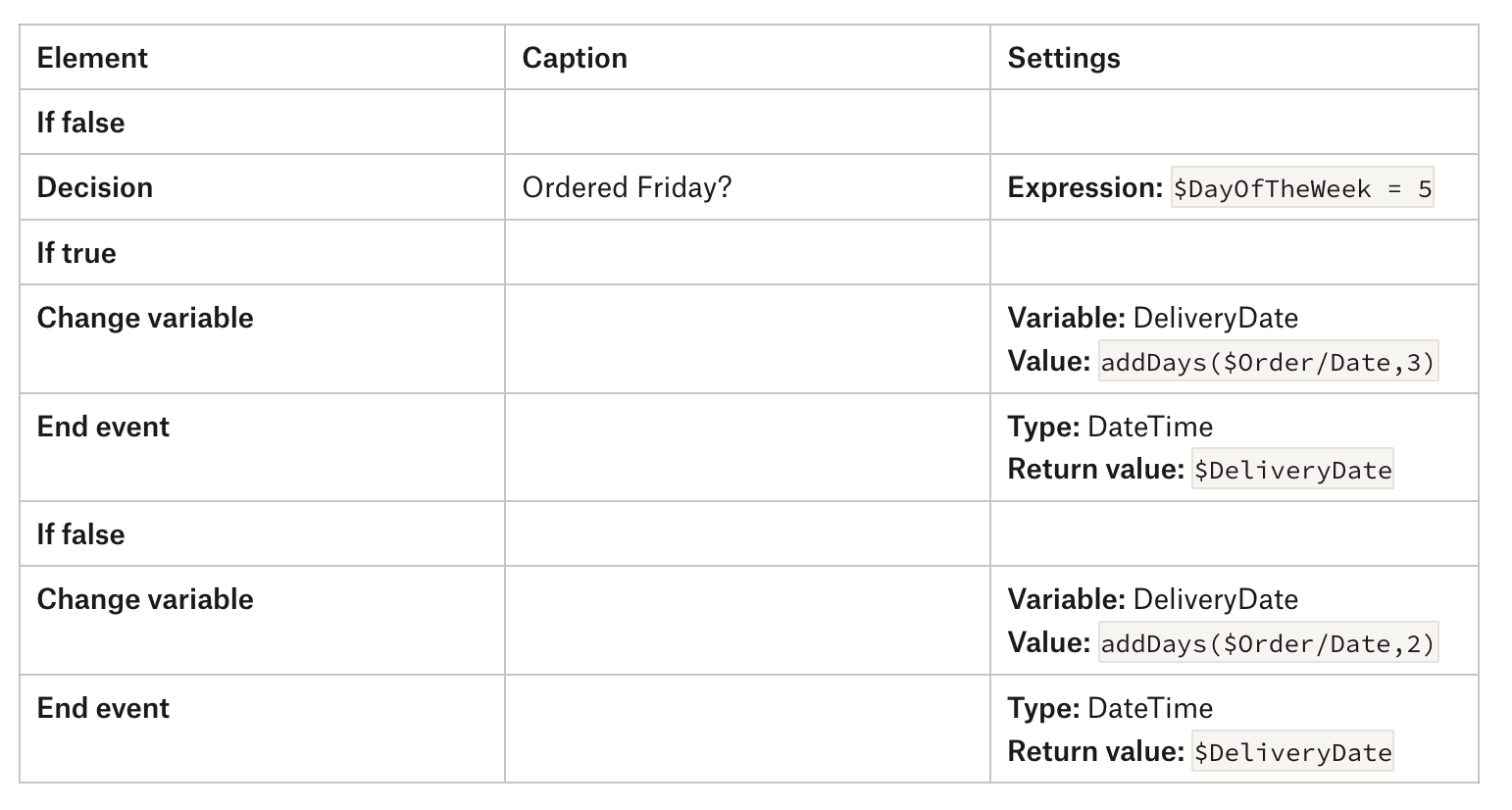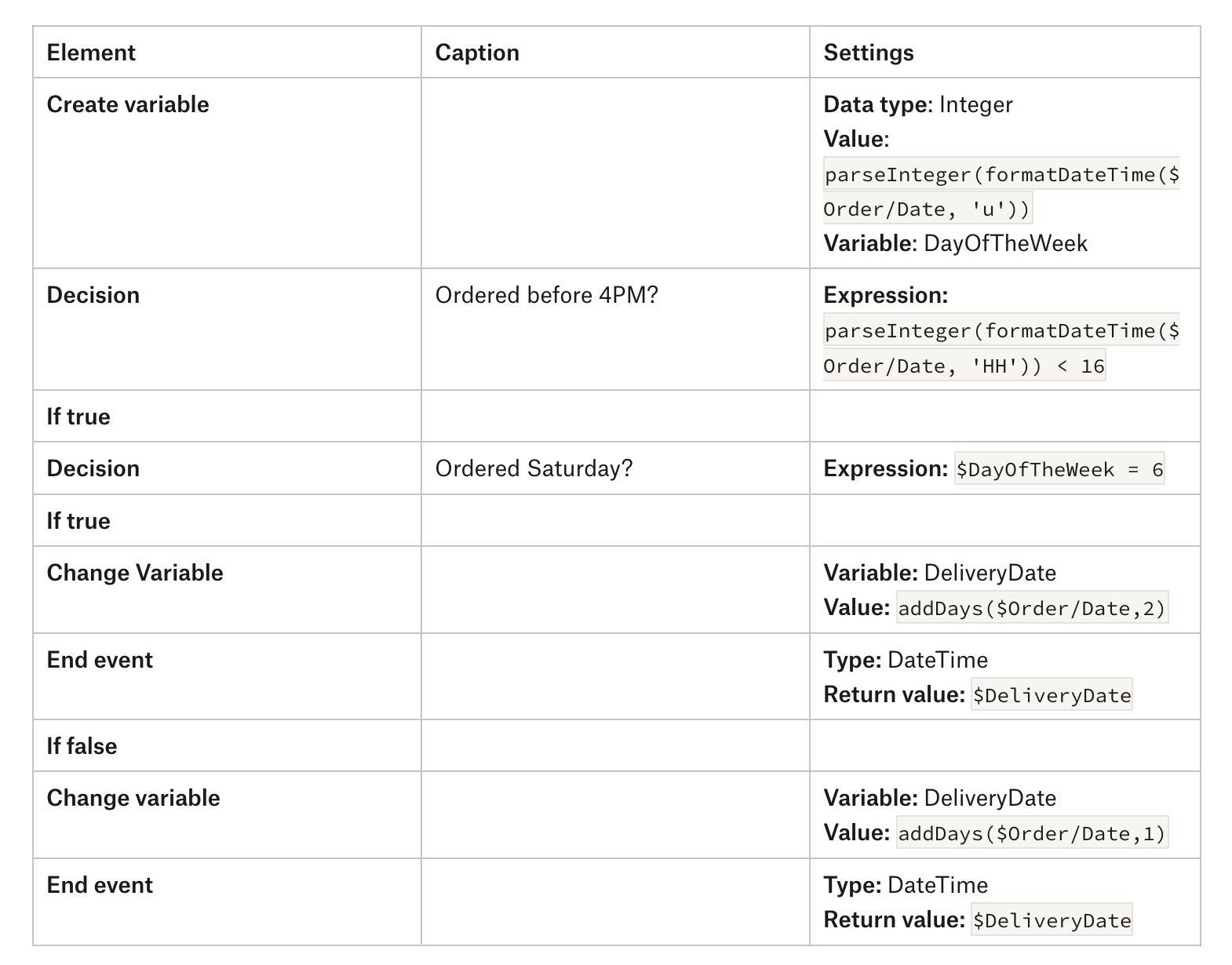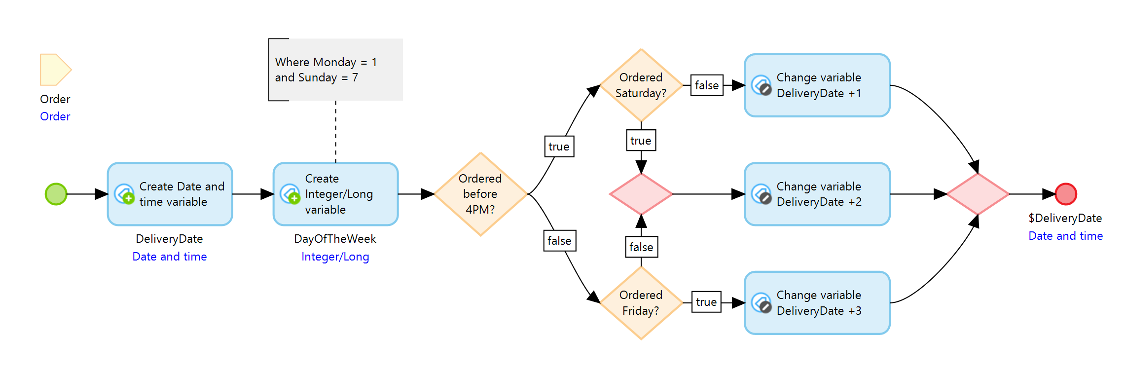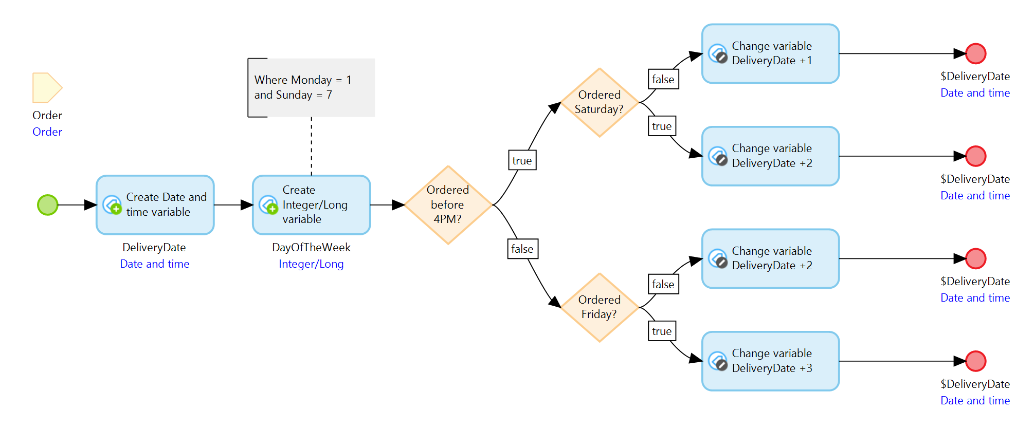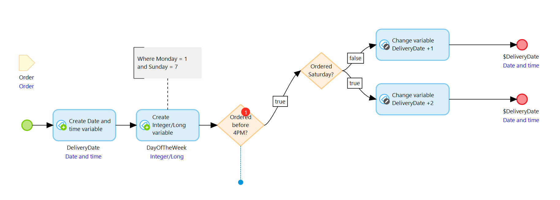 먼저, 주문이 오후 4시 이전에 이루어졌는지 확인해야 합니다. 참인 경우 일요일에 배송되는 것을 피하기 위해 주문일이 토요일인지 알아야 합니다. 이는 다음 요소로 서브 마이크로플로를 확장하여 달성할 수 있습니다.