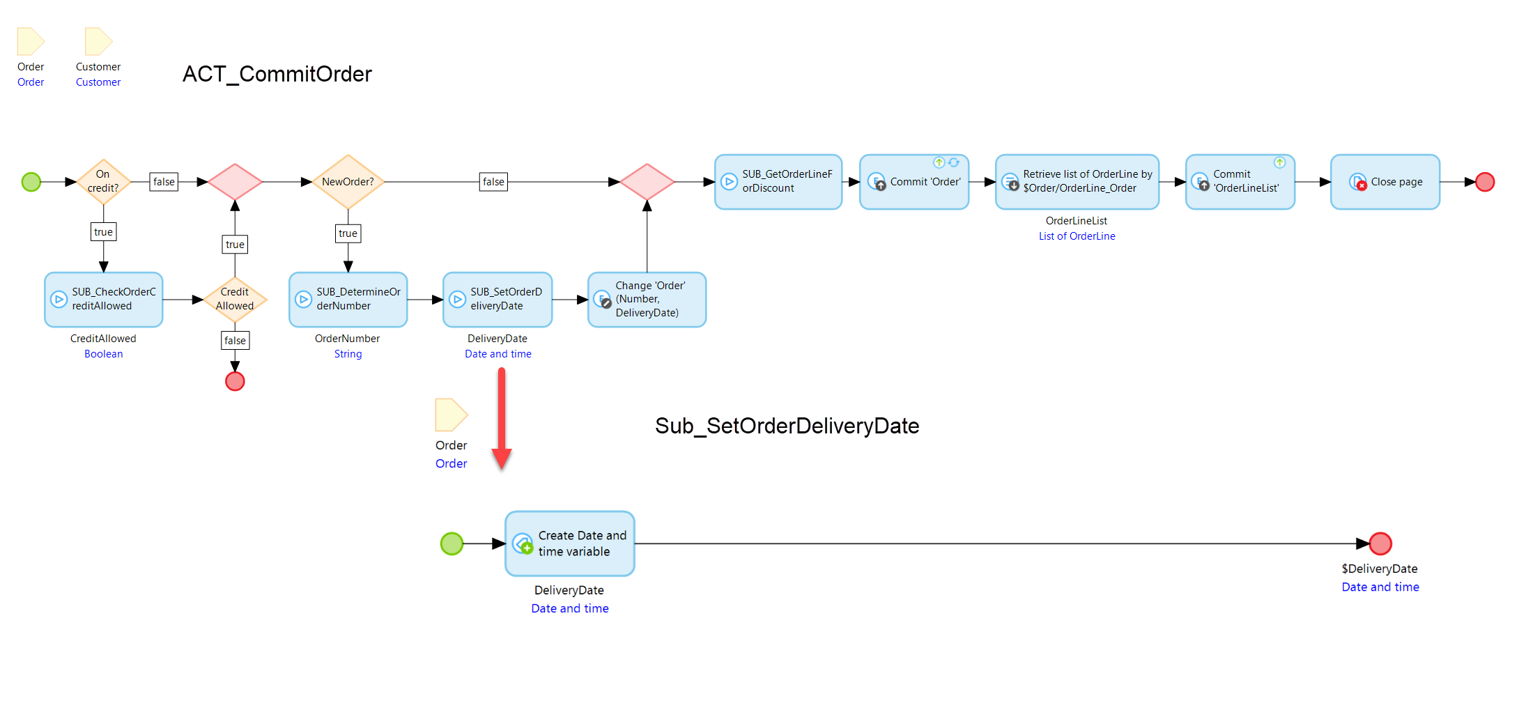 ACT_CommitOrder 마이크로플로 는 주문과 해당 주문 라인을 커밋합니다. 커밋하기 전에 마이크로플로는 SUB_SetOrderDeliveryDate 하위 마이크로플로를 호출하여 배송 날짜를 결정합니다. 현재 이 마이크로플로는 주문 날짜를 배송 날짜로 반환합니다.