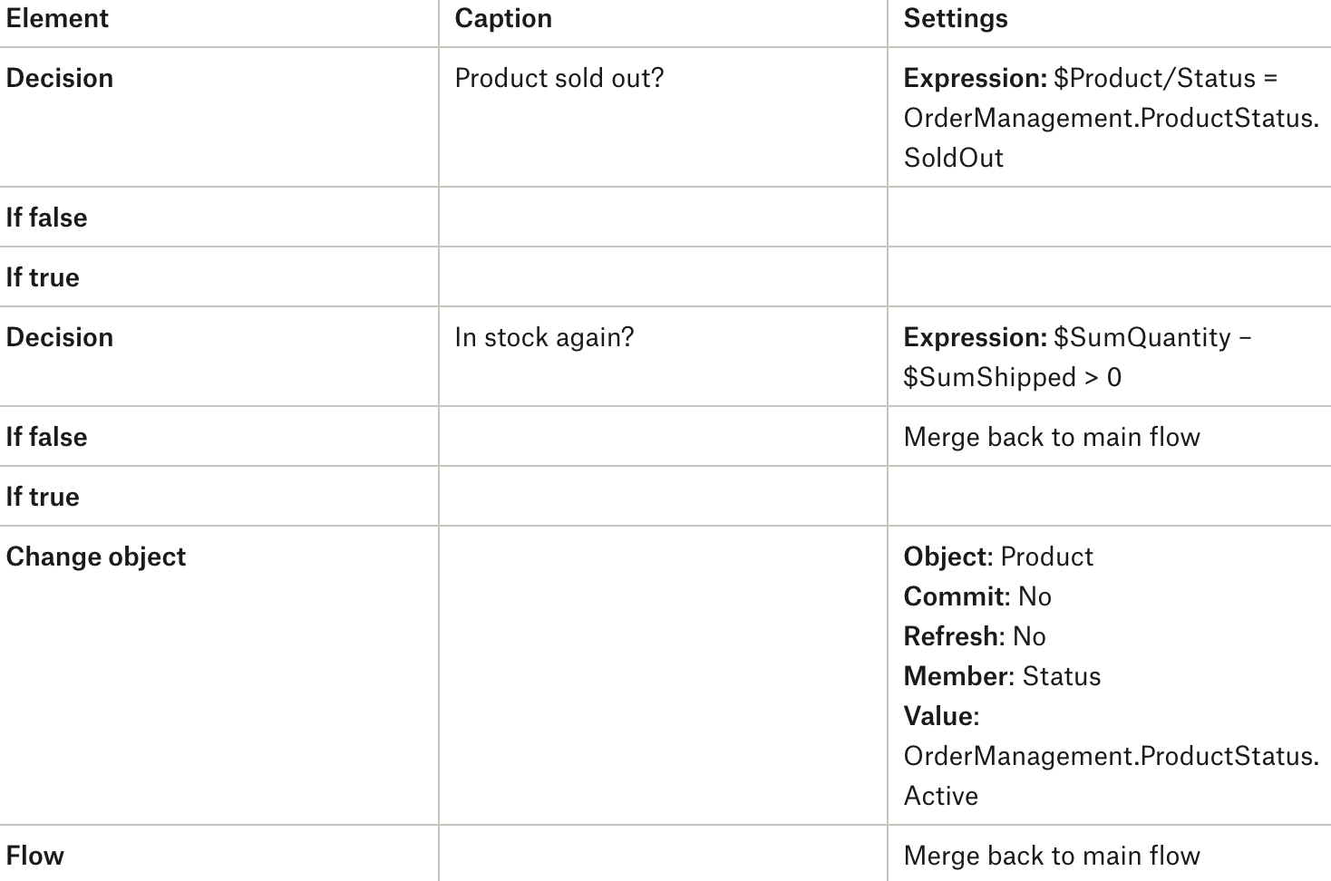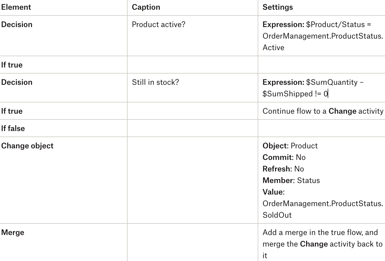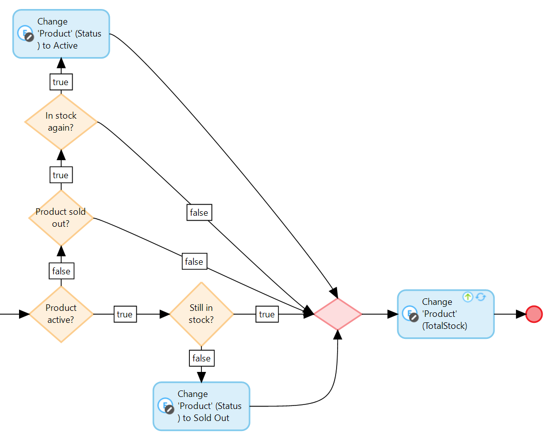 마이크로플로우의 가독성은 if-then-else 문을 여러 가지 결정으로 나누어 개선할 수 있습니다. 먼저, 제품이 활성 상태인지, 아직 재고가 있는지 알아야 합니다. 재고가 없으면 상태를 Sold Out(품절) 으로 변경해야 합니다 . 두 경우 모두 총 재고를 $SumQuantity – $SumShipped(배송됨)로 업데이트해야 합니다.