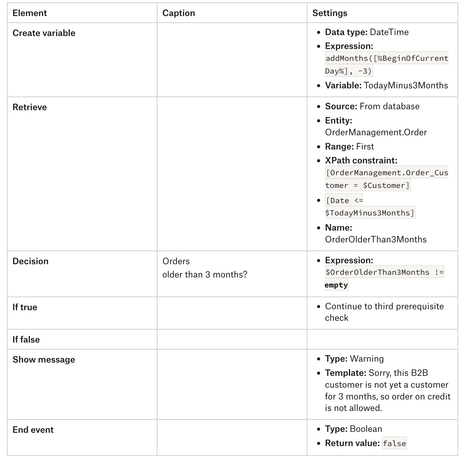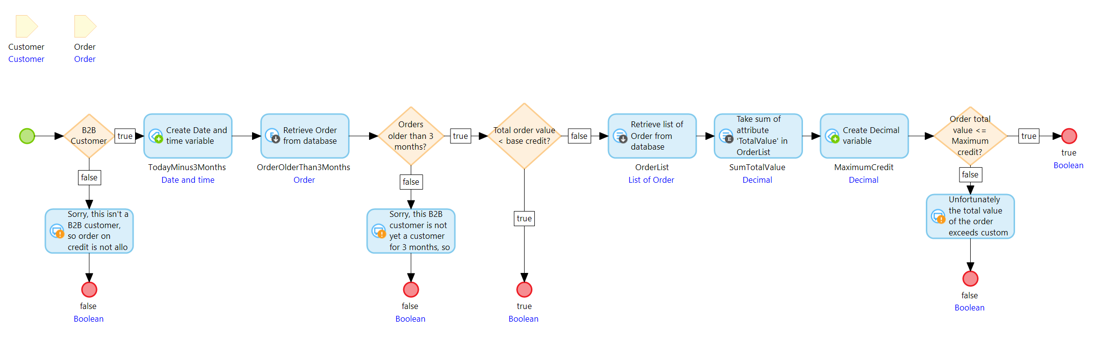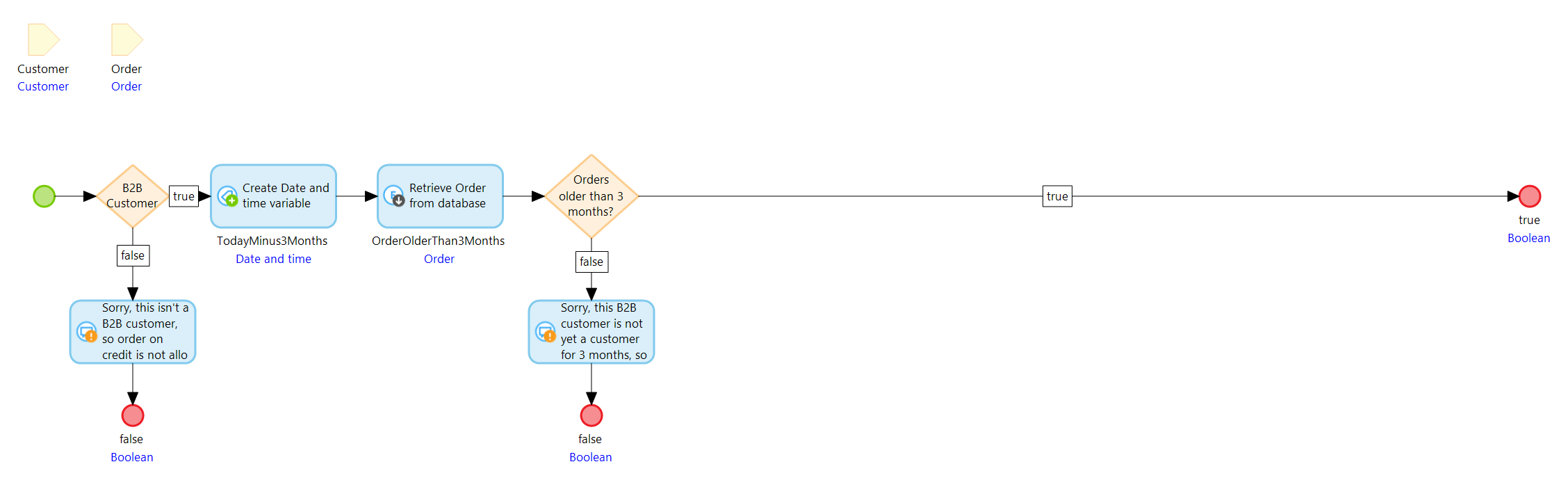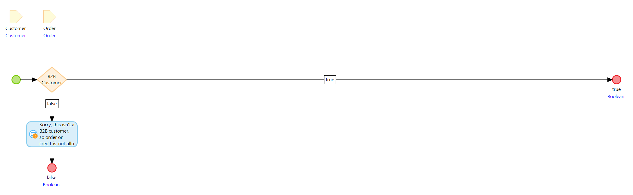고객이 B2B 고객이 아닌 경우 신용 주문은 허용되지 않으며 마이크로플로는 중단되고 false 를 반환해야 합니다.