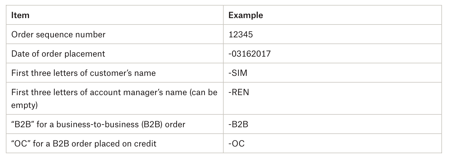 Car Supply는 고유한 순서 번호와 고객 정보를 기반으로 모든 주문에 대한 주문 번호를 원합니다. 이 번호는 송장 발행 시 주문을 처리하는 방법에 대한 정보를 제공하는 것이 목표입니다.
