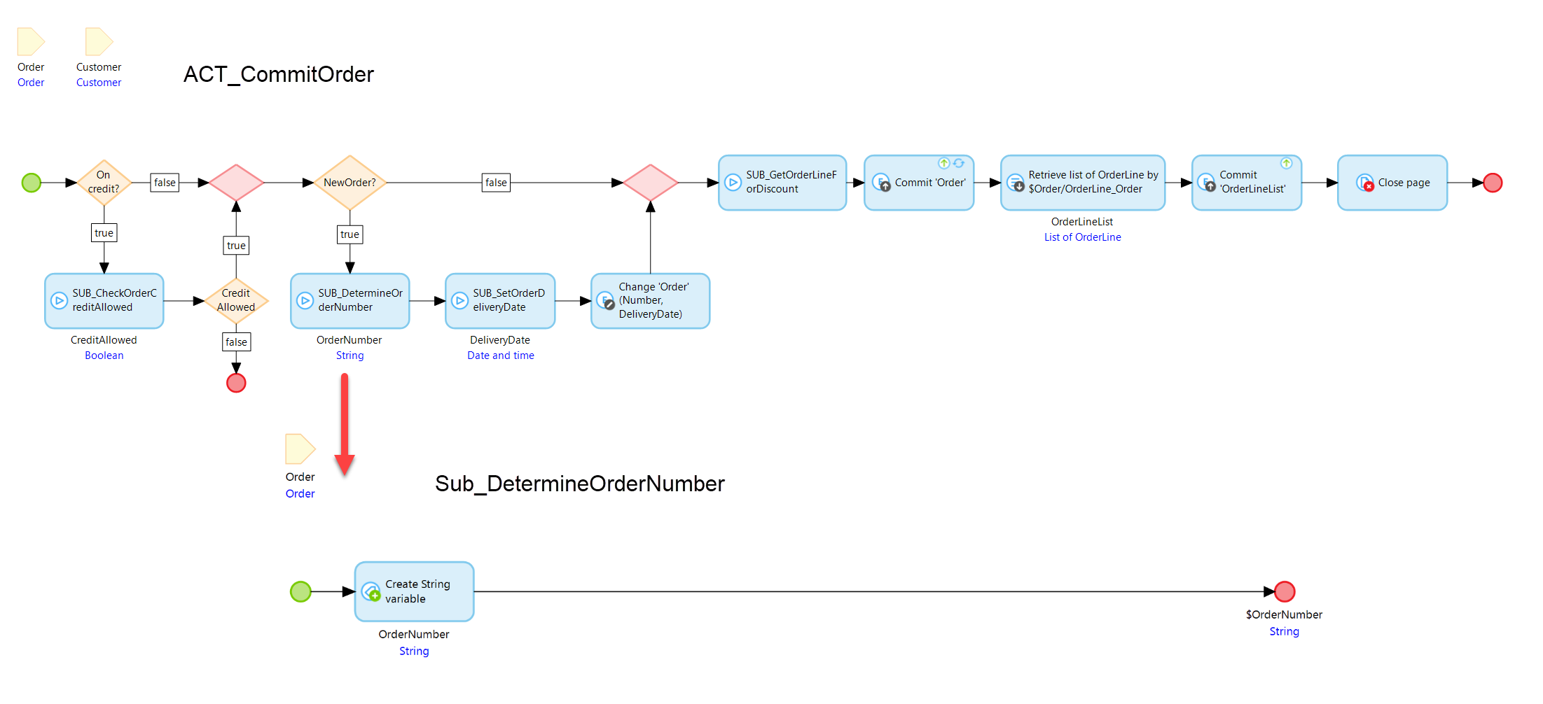 ACT_CommitOrder 마이크로 플로 는 주문과 해당 주문 라인을 커밋합니다. 커밋하기 전에 마이크로플로는 새 주문인지 기존 주문인지 확인합니다. 새 주문의 경우 주문 번호는 SUB_DetermineOrderNumber 하위 마이크로플로에서 결정됩니다. 현재 이 마이크로플로는 주문 번호로 주문 시퀀스 번호를 반환합니다.