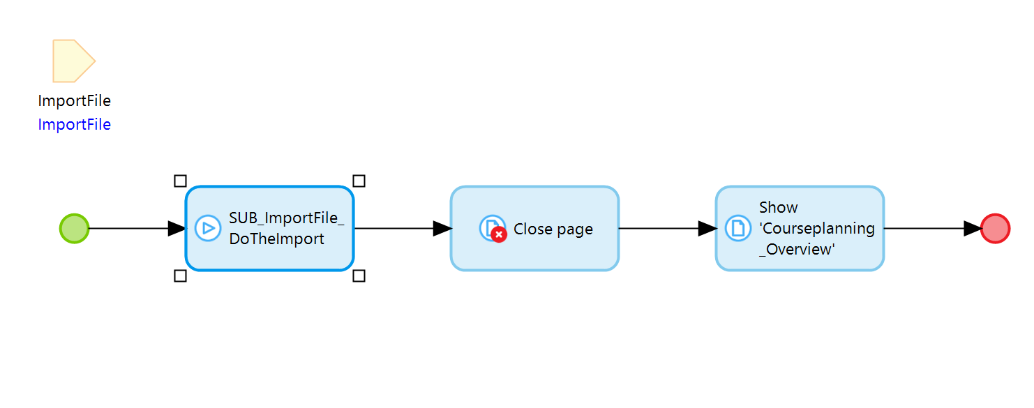 Josh는 사용하기 전에 앱에서 Excel의 초기 데이터를 원하기 때문에 이 강의에서는 먼저 Excel 가져오기 기능을 만들 것입니다. 전체 기능은 마이크로플로 ACT_ImportFile_StartImport_Courseplanning 에서 구현됩니다. 이 마이크로플로는 이미 연 팝업에서 Start import 클릭하면 트리거됩니다 .