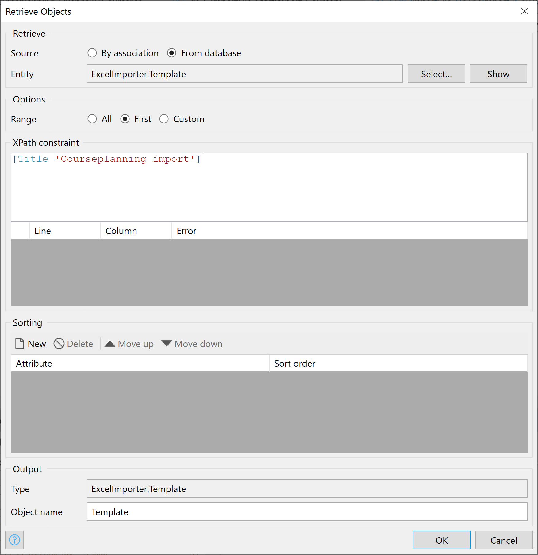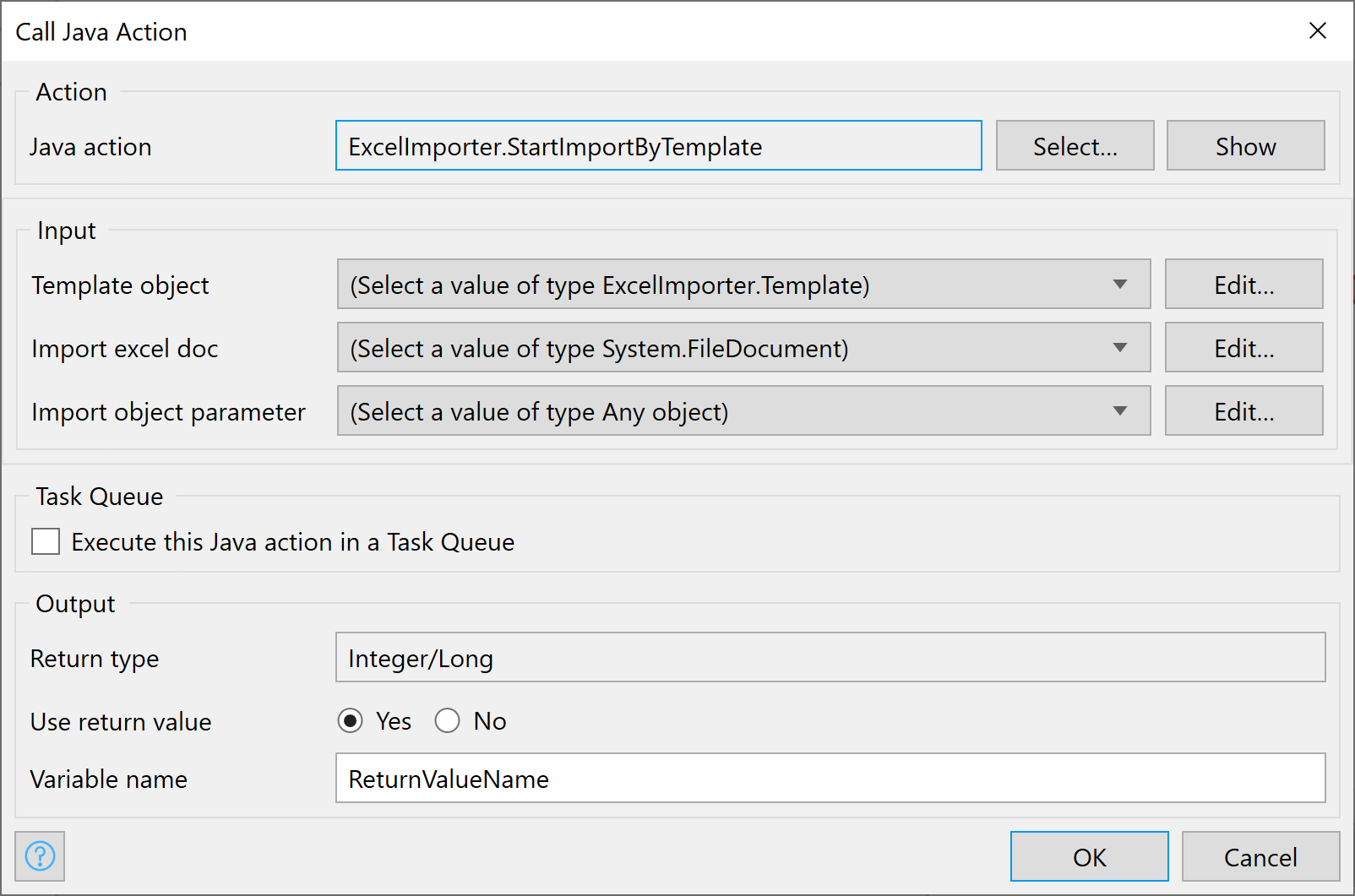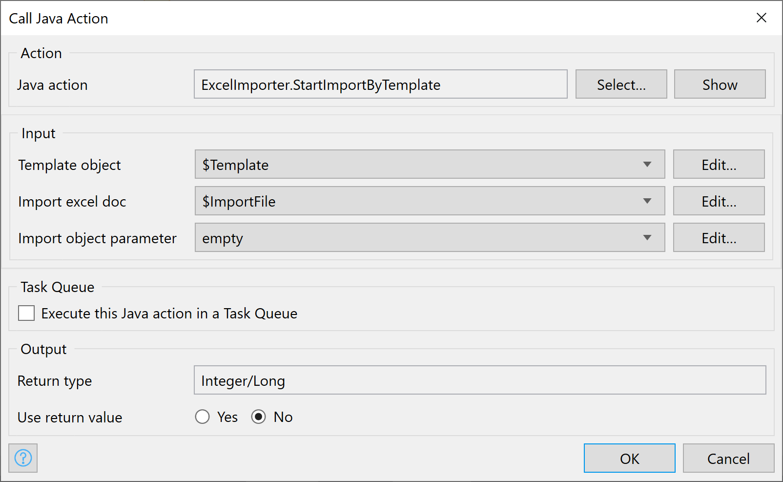 Excel 파일을 가져오는 것은 표준 Mendix 작업으로 수행할 수 없으므로 JAVA 작업을 추가해야 합니다.